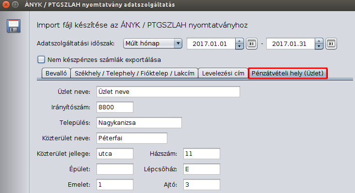 A pénztárgép kiváltására a PTGSZLAH nyomtatványon történő adatszolgáltatás használható. Ezt a funkciót a Számla modul > NAV (zöld nyíl) > Havi adatszolgáltatás pénztárgép kiváltására menüpontban érheti el. A sikeres adatszolgáltatás érdekében azonban ki kell töltenie pár adatot, amelyek automatikusan rákerülnek a nyomtatványra.