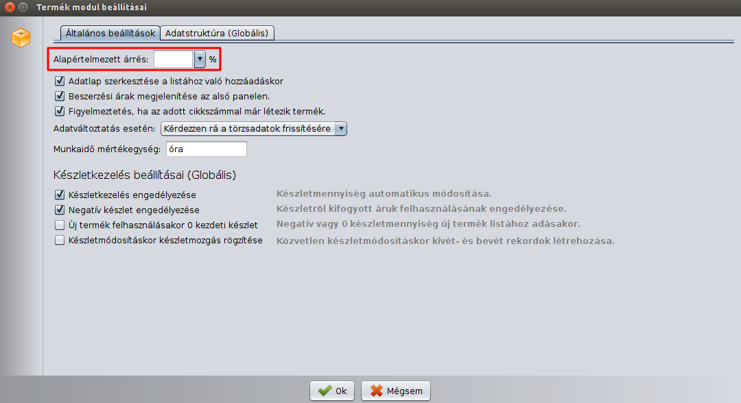 Az alapértelmezett árrés a Beállítások > Termék > Általános beállítások menüben állítható be. Az itt beállított árrés lesz automatikusan beállítva az újonnan felvitt termékeknél.