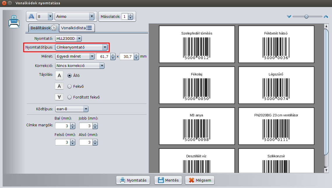 A vonalkódnyomtatókat is támogatja a program. Vonalkódnyomtató használata esetén a vonalkód nyomtatási előnézet ablakban át kell állítani a nyomtató típusát címkenyomtatóra. Így a vonalkódok külön címke lapokra kerülnek.